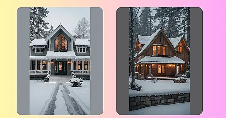This picture is the perfect example of a winter house exterior! Imagine snuggling up inside that warm, inviting house, watching the snow fall while sipping hot cocoa. The warm glow of the lights peeking through the windows makes it look super cozy and like the perfect place to spend a snowy evening playing board games with your family, telling stories, or maybe even sneaking in some extra hot chocolate. It’s giving major “snow day” vibes!