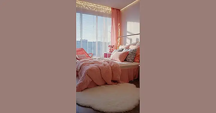 This room is seriously the cutest! Just look at that fluffy pink blanket – it looks like a giant cloud you could snuggle into all day. And those fairy lights strung along the window? Total magic! It’s like sleeping in a cotton candy dream. I bet falling asleep in here is easier than passing a pop quiz (almost!).