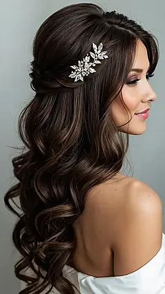 **Paragraph 1:** Check out this gorgeous bridal hairstyle! It’s totally “half-up, half-down,” which is like the Goldilocks of hairstyles – not too up, not too down, just right! The loose curls are super romantic, like something out of a fairytale. And that sparkly hairpiece? It’s like a constellation of tiny diamonds, adding just the right amount of bling without being over-the-top. This is the perfect style for a bride who wants to look elegant but also comfortable and stylish. Imagine dancing the night away without a single strand of hair out of place!