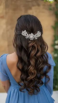 **Paragraph 1:** Check out this gorgeous bridal hairstyle! It’s totally “half-up, half-down,” which is like the Goldilocks of hairstyles – not too up, not too down, just right! The loose curls are super romantic, like something out of a fairytale. And that sparkly hairpiece? It’s like a constellation of tiny diamonds, adding just the right amount of bling without being over-the-top. This is the perfect style for a bride who wants to look elegant but also comfortable and stylish. Imagine dancing the night away without a single strand of hair out of place!