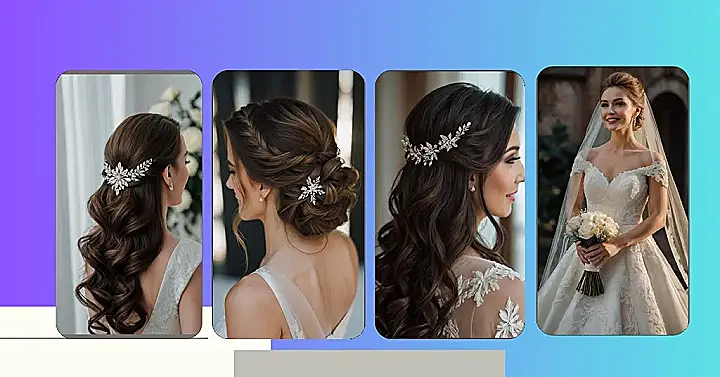 For a balance of both styles, half up half down hairstyles are all the rage this season. They’re ideal for showcasing your beautiful facial features while allowing your locks to catch the eye. You can embrace romantic waves, or go for a smooth, sleek design that brings in an elegant touch—a perfect canvas for adding shiny hair accessories! And for those of you who want to channel your inner queen, a crown braid will have you feeling like royalty on your special day.