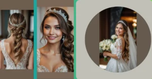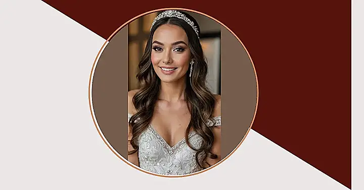 The picture shows a bride who looks absolutely stunning. Her hair is styled perfectly, with a sparkling tiara that makes her look like a real-life princess. The makeup is just as amazing, with flawless skin and a touch of shimmer on her eyes. It’s like she stepped out of a fairytale!