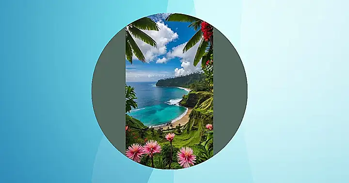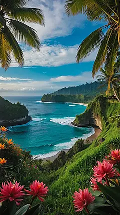 Imagine you’re standing on a hilltop in Bali, surrounded by a symphony of colors. You’re looking down on a sparkling turquoise ocean, with white waves gently lapping against the golden sand. The view is so breathtaking that you can almost hear the ocean whispering “Come swim with me!” But wait, something’s blocking your view! Oh, it’s just some friendly palm trees, trying to steal your attention with their swaying fronds. Maybe they think they’re prettier than the ocean, with their bright red flowers blooming proudly like little fireworks! Haha, what a funny bunch, those palms are. They’re so dramatic.