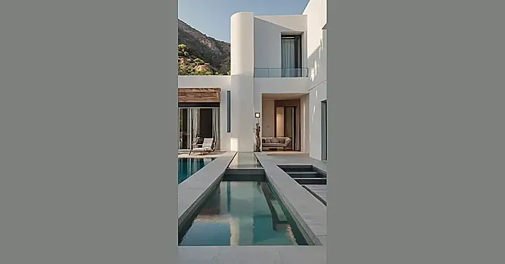 This picture shows a beautiful modern villa with a swimming pool. It looks like a perfect place to relax and enjoy the sunshine. The villa has big windows that let in lots of natural light, and the stone steps leading down to the pool make you feel like you’re entering a secret oasis. You can almost imagine yourself lounging on the comfy chairs by the pool, sipping on a refreshing drink and soaking up the sun!