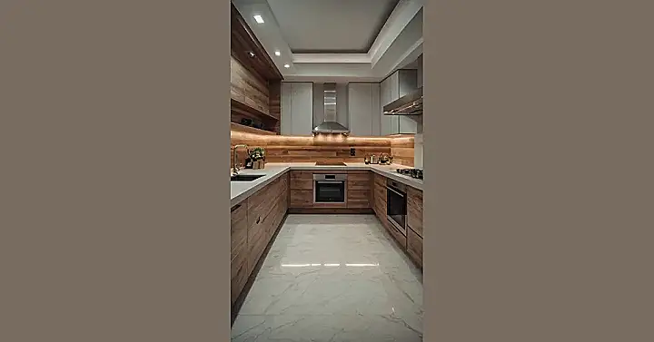 This kitchen is like a dream come true for anyone who loves to cook! With sleek, modern cabinets and a gorgeous marble floor, it feels like something out of a magazine. The wood accents add warmth and a touch of nature, making the whole space feel cozy and inviting. Imagine yourself whipping up delicious meals in this kitchen!