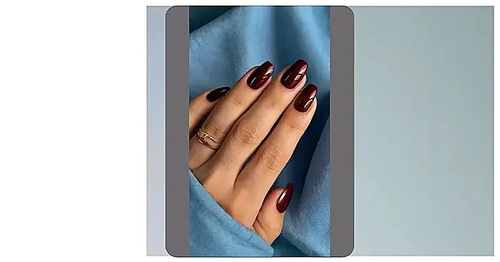 The image shows a hand with perfectly polished burgundy nails. The nails are long and have a shiny, glossy finish. The color is rich and deep, making the nails look incredibly sophisticated. It’s like the perfect blend of a vampy, mysterious look with a touch of elegance – kind of like that cool senior in your class who everyone looks up to.