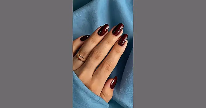 The image shows a hand with perfectly polished burgundy nails. The nails are long and have a shiny, glossy finish. The color is rich and deep, making the nails look incredibly sophisticated. It’s like the perfect blend of a vampy, mysterious look with a touch of elegance – kind of like that cool senior in your class who everyone looks up to.