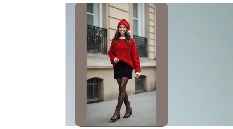 This look really shows off how you can mix festive fun with everyday cool. We’ve got the comfy, chunky red sweater giving all the cozy vibes, but then BAM – a super chic black mini skirt, sleek tights, and some seriously stylish brown boots to keep it from looking like you just rolled out of bed to open presents. It’s the perfect blend of ‘I’m here to spread holiday cheer!’ and ‘Don’t underestimate my fashion game.’ She’s probably just popped out to grab some gingerbread lattes, but she’s doing it with more sparkle than a freshly decorated tree.