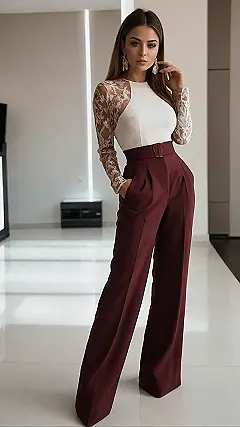This outfit is like a chameleon – it can go from school to a fancy dinner with just a few tweaks! The white top with its delicate lace sleeves is totally classy, but the maroon pants with the cool belt make it way more casual. Imagine pairing this outfit with some sneakers for a chill day, or switching to heels for a night out. It’s like having two outfits in one, which is a total win for any busy teenager!