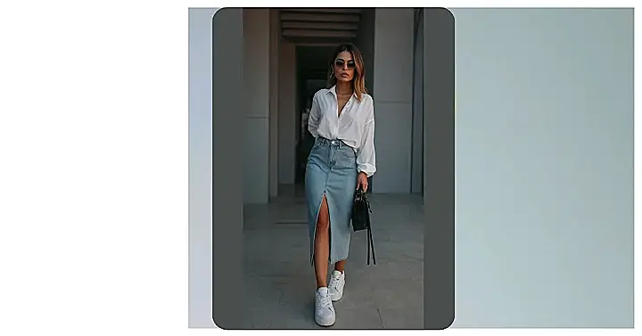 The girl in the picture knows how to rock a denim skirt! She looks totally cool and confident in her white button-down, jeans, and those awesome white sneakers. It’s like she’s saying, “I’m comfortable, but I still got style!” This outfit is perfect for a day out with friends or even a casual lunch date. It’s easy to put together, but it makes you feel like a million bucks.