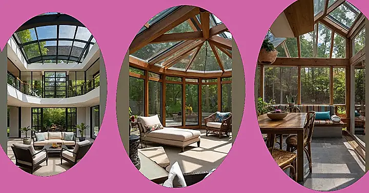 Imagine this: You’re chilling in a super comfy sunroom, sunlight streaming in through a glass ceiling like a giant, beautiful skylight! It’s basically a room made of windows, so you get all the best parts of being outside—fresh air and sunshine—without getting sunburnt or dealing with pesky bugs. Plus, this room is seriously stylish—like something straight out of a magazine. It’s got that modern farmhouse vibe, with cozy furniture and a rug that looks super soft. It’s the perfect place to relax with a good book and a glass of lemonade (or maybe hot cocoa if it’s a little chilly!).