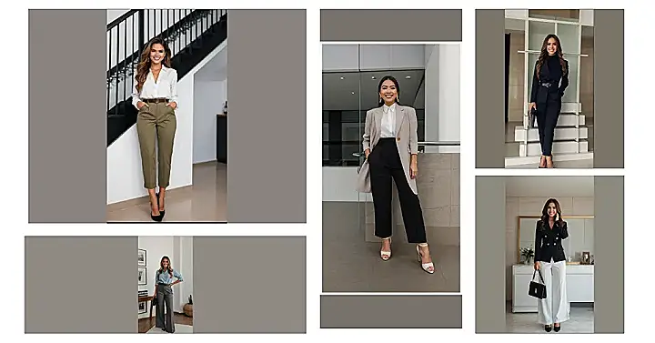 This woman is rocking a super stylish outfit that proves you can look professional without looking like you just stepped out of a stuffy office. The crisp white shirt and beige pants are classic, but the interesting details, like the cool belt and the way the pants are cut, give it a modern, trendy feel. Plus, she’s got the confidence of a boss! Imagine walking into your next big presentation in this outfit. You’ll be owning the room in no time!