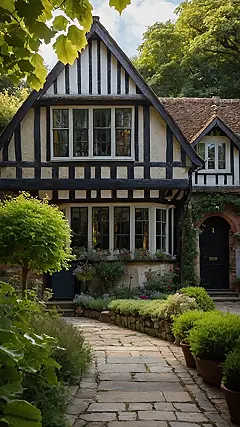 This house is like something straight out of a storybook! Imagine a cozy English village, with cobblestone streets and quaint shops, and a little cottage tucked away amongst the greenery. This is it! It’s got that classic black and white timber framing that looks like it’s been around for centuries, and those big windows let in all the sunshine. You can almost picture yourself sipping tea on the patio with a good book, listening to the birds chirping in the garden.