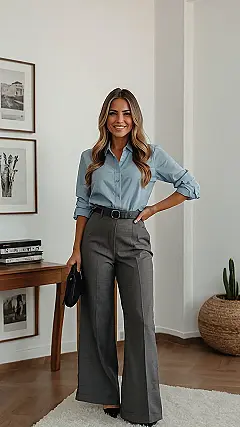 This outfit is like a superhero costume for grown-ups! The lady in the picture is rocking a classic blue button-down shirt and some seriously cool wide-leg pants. It’s like she’s ready to take on the world, but instead of saving the day, she’s probably just going to a meeting about budgets or something. But hey, even important meetings need a little style, right?