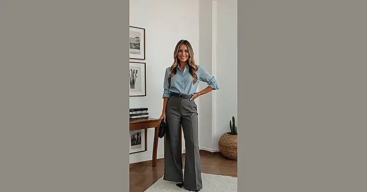 This outfit is like a superhero costume for grown-ups! The lady in the picture is rocking a classic blue button-down shirt and some seriously cool wide-leg pants. It’s like she’s ready to take on the world, but instead of saving the day, she’s probably just going to a meeting about budgets or something. But hey, even important meetings need a little style, right?
