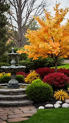 This picture makes me want to grab a warm cup of apple cider and take a stroll through the fall garden. The leaves are a riot of color—bright orange, deep red, and golden yellow—like someone spilled a giant paint bucket all over the trees. The fountain is the perfect touch, adding a gentle bubbling sound that makes you feel peaceful. It’s like the garden is whispering, “Take a break, relax, and enjoy the beauty of fall!”