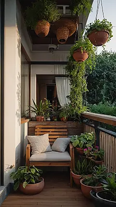Imagine having your own little slice of nature, right outside your door! This picture shows a balcony transformed into a cozy garden, bursting with green life. There are plants hanging from the ceiling, plants sitting on shelves, and even a little table and chair to enjoy a cup of tea surrounded by leafy friends. It’s like a mini jungle, but instead of scary animals, you’ve got cute little pots and happy plants.