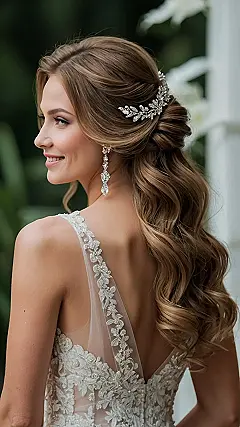 This hairstyle is totally wedding-ready! Imagine yourself walking down the aisle, feeling like a princess with gorgeous, flowing curls. That sparkly hair clip? It’s like a tiny firework show for your hair, adding extra glam to an already stunning look. It’s the perfect mix of elegant and fun – you’ll feel amazing and won’t have to worry about your hair getting in the way of all the dancing!