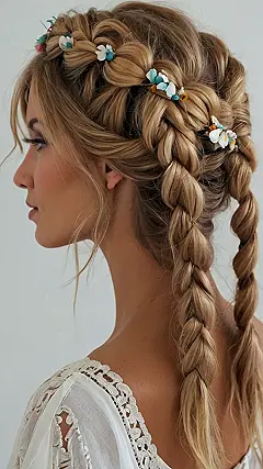This hairstyle is totally groovy, man! It’s like a modern take on those awesome hippie hairstyles from back in the day, but way more polished. See those braids? They’re not your grandma’s braids; they’re intricate and stylish, kind of like a secret code only cool people understand. It’s the perfect blend of relaxed beach waves and carefully crafted braids—a total vibe. You could totally rock this look at a festival, a summer party, or even just hanging out with your friends.