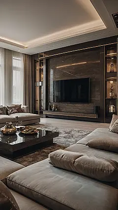 This living room is straight out of a magazine! The giant chandelier is like a sparkly cloud hanging over the couch, and the big, comfy sofa looks like the perfect place to relax. With all the gold accents and fancy furniture, it’s definitely giving those rich vibes. Imagine sitting on that couch, sipping some fancy tea, and watching a movie. It’s basically a dream come true!
