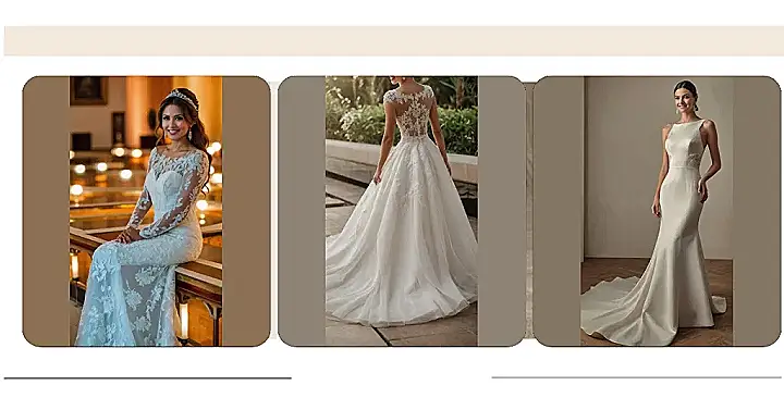 Wow, check out this gorgeous white wedding dress! It’s like a princess gown went to a fancy tea party – all satin and shimmer, with delicate champagne-colored lace adding a touch of “ooh la la.” The long sleeves are super elegant, and that criss-cross neckline is seriously stylish. It’s the perfect blend of classic elegance and modern chic, making it ideal for any bride who wants to feel like a total queen on her big day.