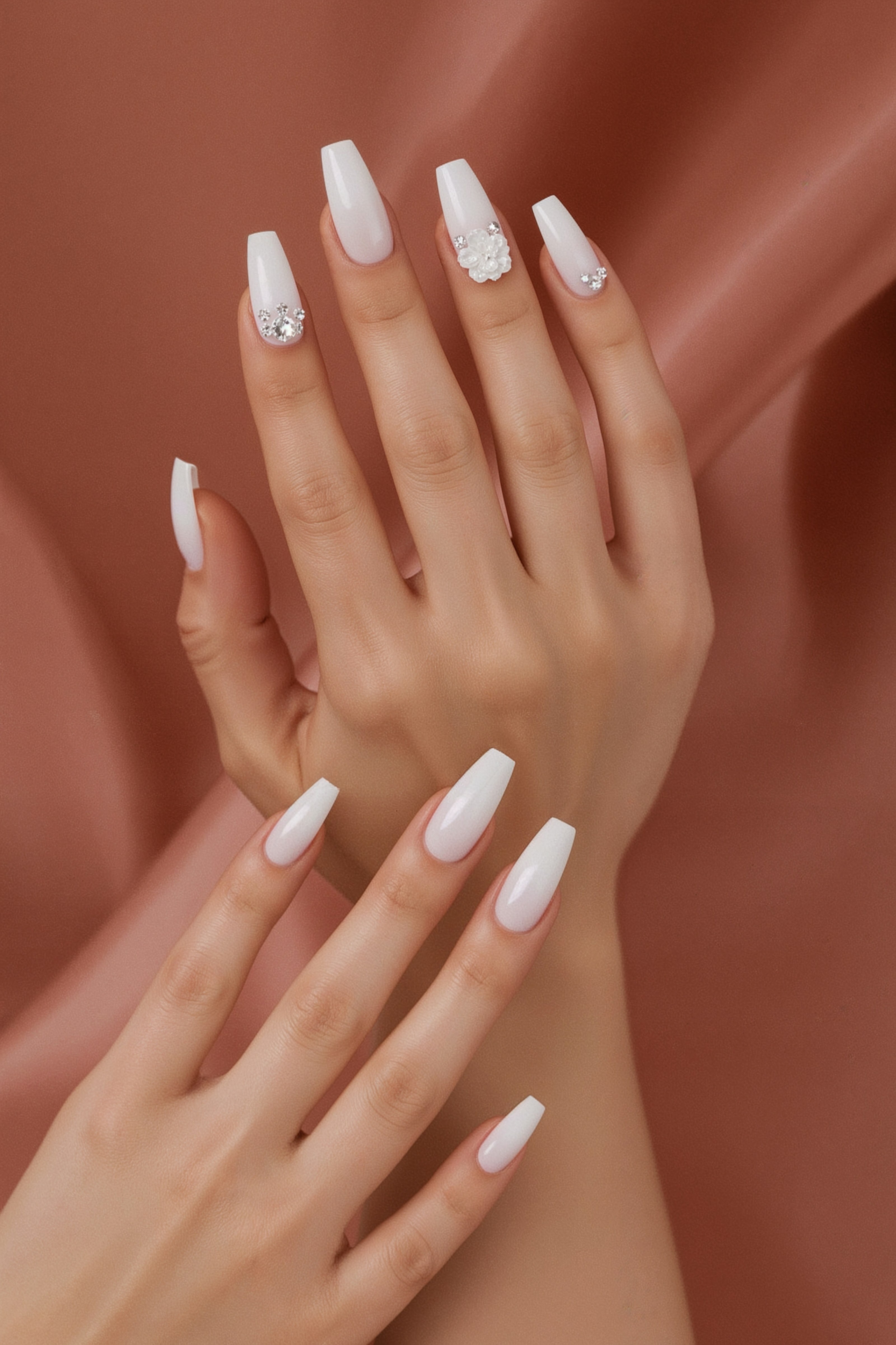Embrace polished elegance with chic white nail gel designs, perfect for any occasion. These classy nails in coffin and almond shapes are adorned with delicate flower details and sparkling rhinestones.