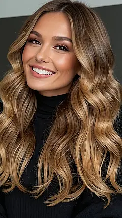 The image shows a gorgeous lady with a smile that could light up a room, and her hair? Well, that’s the star of the show! It’s a “bronde” color, which is a fancy way of saying brown with blonde highlights. But this isn’t just any old highlighting, oh no! It’s a “balayage,” which means the colors blend together super smoothly, like a sunset painting across her hair. It’s totally natural-looking, which is exactly what we all want, right?