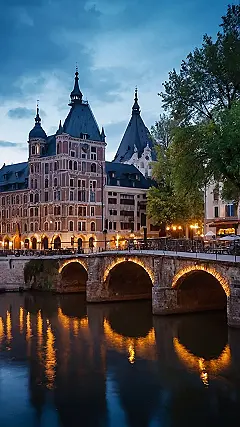 This picture looks like something straight out of a fairytale! It’s a beautiful old building with a ton of windows, all lit up like Christmas lights. The building is so fancy it looks like a castle, and the stone bridge looks like something out of an old movie. The water is super calm, and the whole thing just looks magical.