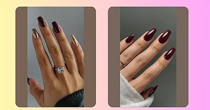 This picture shows some pretty awesome nail paint, right? The dark red on some nails and the sparkly gold on others is super cool. It kinda reminds me of a fancy party outfit – dark and elegant, but with a touch of glitz!