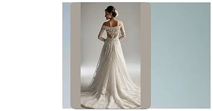 Seriously, that dress is the ultimate dream! The long sleeves and off-the-shoulder neckline are so chic, and the way the lace details hug her figure is just magical. It’s giving us major princess vibes, but with a modern twist. I bet she feels like a queen, and rightfully so! It’s the kind of dress that makes you want to dance all night long at your wedding.