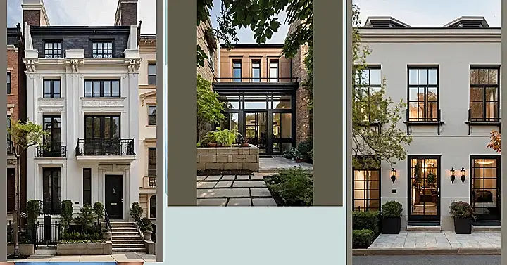 These townhouses are like a delicious layer cake ‚Äì each one a different flavor! You’ve got your dark chocolate (that’s the deep brown one!), your creamy vanilla (the light beige one), and even a hint of red velvet on top (check out that roof!). They all stand together, side-by-side, creating a beautiful, charming street scene. Imagine living in one of these, maybe baking cookies and watching the world go by from your window, or inviting friends over for a movie night ‚Äì the perfect blend of stylish living and cozy comfort.
