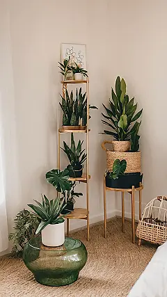 Looking at this room, it’s pretty clear that someone decided boring old wall art just wasn’t cutting it. Instead, they went all-in on living, breathing room decor items that actually *do* something – like, you know, make oxygen! You’ve got plants stacked up like leafy skyscrapers, chilling on shelves, and even casually hanging out in chic woven baskets. It’s like these plants are having a secret party, and their only requirement for entry is to look fabulously green and make the place feel super fresh. Who needs a pet when you have a whole army of plants to talk to? (Don’t worry, they’re excellent listeners.)