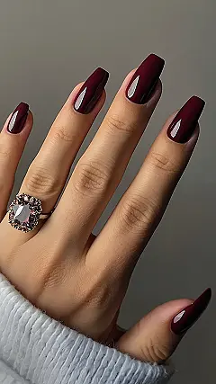 Check out these gorgeous burgundy nails! They’re like a sophisticated glass of wine – rich, deep, and totally classy. The color is perfect for anyone who wants to feel fancy without trying too hard, kind of like wearing your favorite comfy sweater but still looking amazing. And that ring? It’s the cherry on top of a seriously stylish sundae! It adds a touch of sparkle and pizzazz, proving that sometimes, a little bling is all you need to elevate your look.