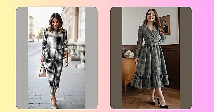 Check out this awesome look! This lady is absolutely rocking a super stylish gray checked dress that makes her look ready for anything, from a fancy school presentation to secretly planning world domination (in the nicest way possible, of course). The way the dress buttons up like a cool trench coat on top and then flares out with a fun ruffle at the bottom is just brilliant. It’s got that classic vibe that makes you think of old movies, but her huge smile makes it totally fresh and modern. Plus, those simple gold hoops? Chef’s kiss!