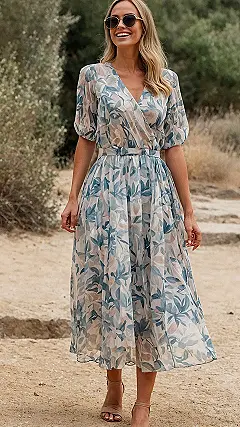 Finding the perfect wedding guest dress can feel like a mission impossible, right? You want to look amazing, but definitely not like you’re trying to outshine the bride (that’s a major no-no!). This gorgeous flowy dress totally nails the brief. With its pretty blue and beige leaf pattern, it’s like you’re bringing a calm, chic garden vibe to the celebration. Plus, that V-neck and those comfy sleeves mean you can totally bust out your most questionable dance moves without feeling like you’re wrapped in a stiff gift box. Get ready to look effortlessly cool and be the first one in line for dessert!