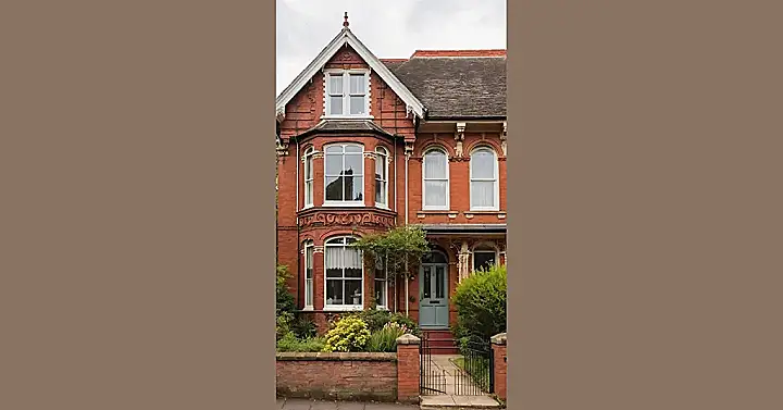 Just peek at that cool light blue front door, looking like it belongs to a secret garden or a super polite wizard’s cottage. And those windows? There are so many, you’d never have to fight for a good spot to watch the world go by – or maybe stage a dramatic reading of your history homework. It’s got all the classic Victorian charm, from the pointy bits on the roof (definitely for catching rogue clouds) to the climbing plants that seem to be giving the house a big green hug. You can tell it’s seen countless trends come and go, probably just shaking its brick head at all the minimalist designs today, muttering about ‘kids these days’ and their lack of fancy cornices.