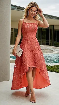 Finding the perfect wedding guest dress can feel like a mission, especially when you want to look super chic but also be comfy enough to actually enjoy the party (and maybe snag an extra slice of cake!). This stunning coral dress totally gets it. With its fancy lace overlay and a color that screams “happy vibes,” you’ll look like you just stepped out of a magazine without accidentally stealing the spotlight from the bride. Plus, that high-low hem is basically a secret weapon – it’s formal enough for the ceremony but totally ready for you to bust out your best dance moves later without tripping!