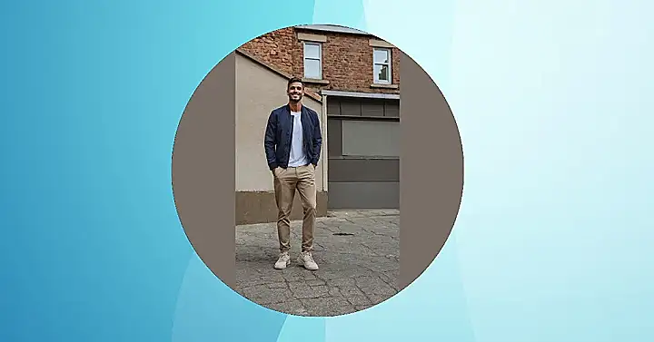Take a look at this guy, beaming with a smile that just screams, ‘My outfit is on point!’ He’s nailed the perfect ‘pants outfit for men’ with a smart blue shirt and super crisp white pants. This combo isn’t just easy to wear; it’s practically a superpower for looking sharp and confident, whether you’re heading to a casual hang-out or somewhere a bit more fancy. Those bright white pants really stand out against his cool blue top, making a statement that says you know how to dress without even trying too hard.