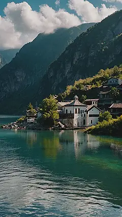 This picture shows a tiny village nestled between some seriously impressive mountains. The houses are all white and kind of cute, like something out of a fairy tale. The water is crystal clear and a gorgeous teal color, making you just want to jump in and swim! This place looks so peaceful and quiet, it’s like stepping into a different world. Imagine just chilling out there with no stress, no homework, no drama – just you, nature, and maybe a good book!