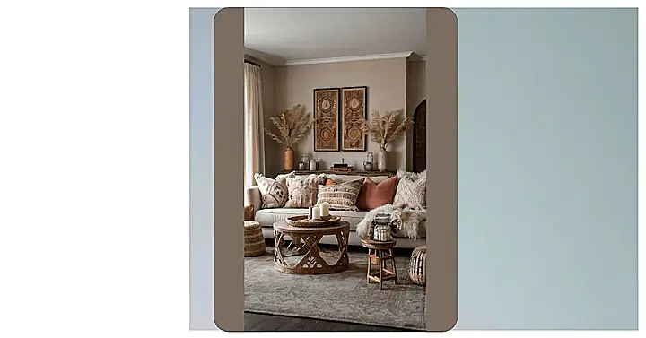 **Paragraph 1:** Whoa, check out this living room! It’s like stepping into a super-relaxed, earthy paradise. All those fluffy pillows and blankets make me want to curl up with a good book and never leave. The colours are so calming—think sandy beaches and warm sunsets. And those tall, feathery plants? They’re like nature’s stylish decorations! The whole vibe screams “boho chic,” which basically means it’s super comfy, has a bunch of natural elements, and feels totally unique and awesome. It’s a space that just invites you to relax and let go!