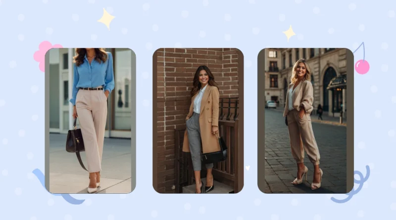 The picture shows a woman rocking a classic fall outfit: a light blue button-down shirt tucked into beige pants, a sleek black handbag slung over her shoulder, and some stylish white heels. It’s a look that says, “I’m ready to take on the world!” She’s got that effortless chic thing going on, and honestly, who wouldn’t want to look that put-together, even on a chilly fall day?
