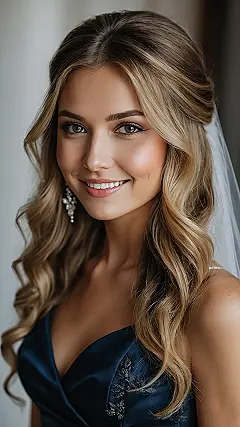 Checking out hairstyles like the one in the picture gives you major inspiration. That mix of flowing waves and a chic half-up detail is basically the ideal look. It keeps your hair out of your eyes during the important parts, lets those sparkly earrings shine, and just gives off happy, confident vibes. Getting your hair done this cute for your friend’s big day is part of the fun of being a bridesmaid, making sure you feel fantastic while celebrating love (and looking awesome in all the wedding photos!).