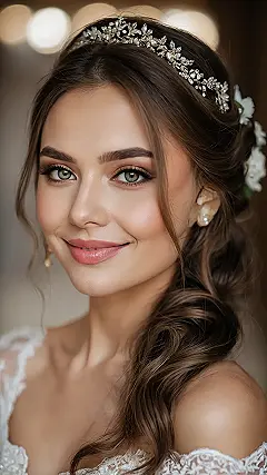 Getting ready for a wedding often means picking a hairstyle that screams ‘romantic princess,’ and this look totally nails it! Forget those stiff updos; this bride’s hair is all about soft waves and delicate strands that perfectly frame her face. The star of the show, besides her amazing smile, has to be that sparkling headband. It’s like a constellation of tiny jewels and pearls, adding just enough sparkle without making her look like she raided a costume box. Plus, those cute little flowers tucked in? They’re the secret sauce for that extra touch of dreamy elegance.
