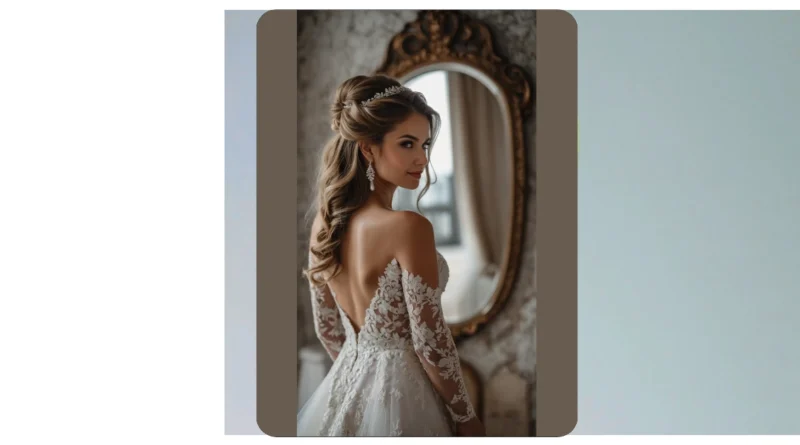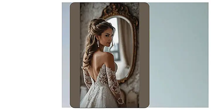 Speaking of looking like royalty, that gorgeous gown with its delicate lace sleeves and open back is basically saying, ‘Yeah, I came to get married, but I also came to slay.’ And that little cheeky glance over the shoulder into the ornate mirror? Pure gold! It’s like she’s thinking, ‘Yup, still got it!’ This whole vibe is peak romantic wedding fantasy, making you almost hear the violins playing in the background. It’s proof that with the right hairstyle, a stunning dress, and a killer smile, you can totally own your big day – just try not to trip on your way down the aisle, because even perfect hair can’t fix that!