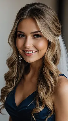 Woah, check out this hair! It’s giving off major “future Mrs.” vibes, and honestly, we’re obsessed. This isn’t just a hairstyle; it’s a masterpiece that says, “I’m ready for my close-up!” We love how it’s half-up, half-down with those gorgeous waves, giving you the best of both worlds – elegant for all the fancy photos, but still super fun and flowy. And that sparkly headband? It’s basically a crown, making sure everyone knows you’re the star of the show, dazzling brighter than any disco ball.