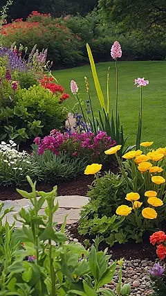 Wow, check out this flower garden! It’s like a painter went crazy with a rainbow, splattering every color imaginable onto the lawn. From the sunny yellows and fiery reds to the cool purples and calming blues, it’s a total explosion of blooms. You could almost smell the sweet perfume from here! I bet the bees are having a field day buzzing from flower to flower, collecting enough pollen for a million honey pots.