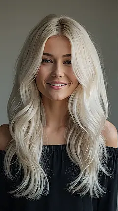 This picture shows a lady with gorgeous platinum blonde hair—the kind that makes you want to run your fingers through it (don’t worry, we’ll wait). It’s so shiny and wavy, it looks like liquid sunshine! She’s rocking a simple white shirt, but honestly, who needs anything else when you’ve got hair like that? It’s the ultimate accessory, like a golden halo, but way cooler. Seriously, this blonde is giving major hair goals.
