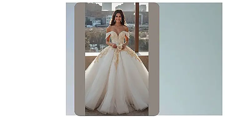 That dress is seriously HUGE! It’s like a cloud of gorgeousness, all fluffy and sparkly. Imagine twirling in it – you’d probably need a whole dance floor, maybe even a small country! The gold embroidery is fancy enough for a princess, but the off-the-shoulder style keeps it from being too stuffy. It’s totally the kind of dress you’d wear if you were going to a super important party or even a fairytale wedding (maybe you’ll be the princess!).