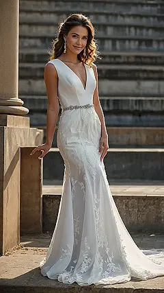 Imagine you’re this model, strolling through a gorgeous garden (or maybe an ancient ruin, if you’re feeling adventurous!), feeling like a total queen in your stunning sheath dress. You’re not tripping over yards of fabric; you’re graceful and confident, ready to say “I do!” This dress makes you feel amazing, so you’re smiling your biggest smile, which perfectly matches the dazzling sparkle of the belt. It’s the perfect combination of elegance and effortless style—a true winner!