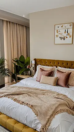 Let’s be real, that wall decor is not just decoration; it’s a whole vibe. The big vintage-looking piece practically screams “artsy,” like you spend your weekends at museums instead of binge-watching reality TV (even if you totally do). And that color scheme is just so calming. It’s like the designer was thinking, “How can I make this room scream ‘good vibes only’?”. You will definitely have the best sleep when your walls look this good.